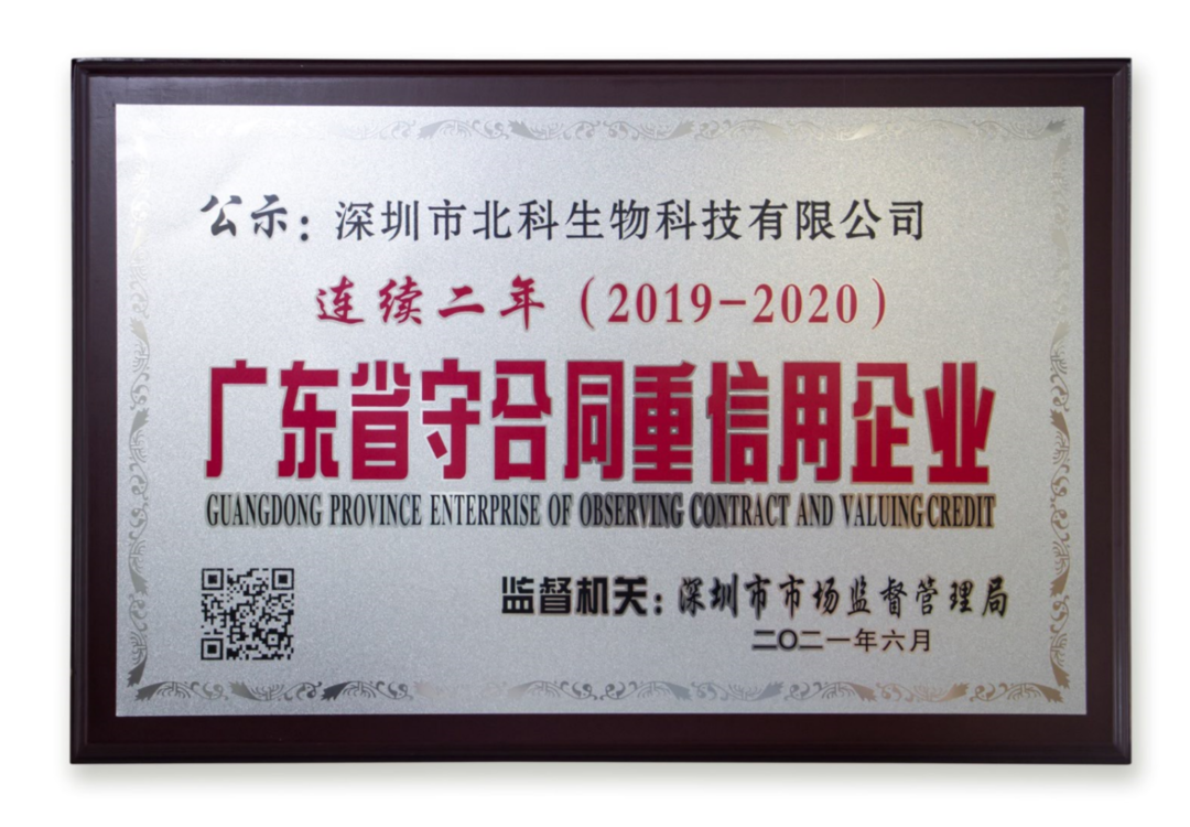 近日,廣東省市場(chǎng)監(jiān)督管理局公布了2020年度廣東省守合同重信用企業(yè)名單。深圳市北科生物科技有限公司順利通過最終評(píng)審,連續(xù)兩年榮獲“廣東省守合同重信用”榮譽(yù)稱號(hào),并獲頒榮譽(yù)證牌匾和榮譽(yù)證書。