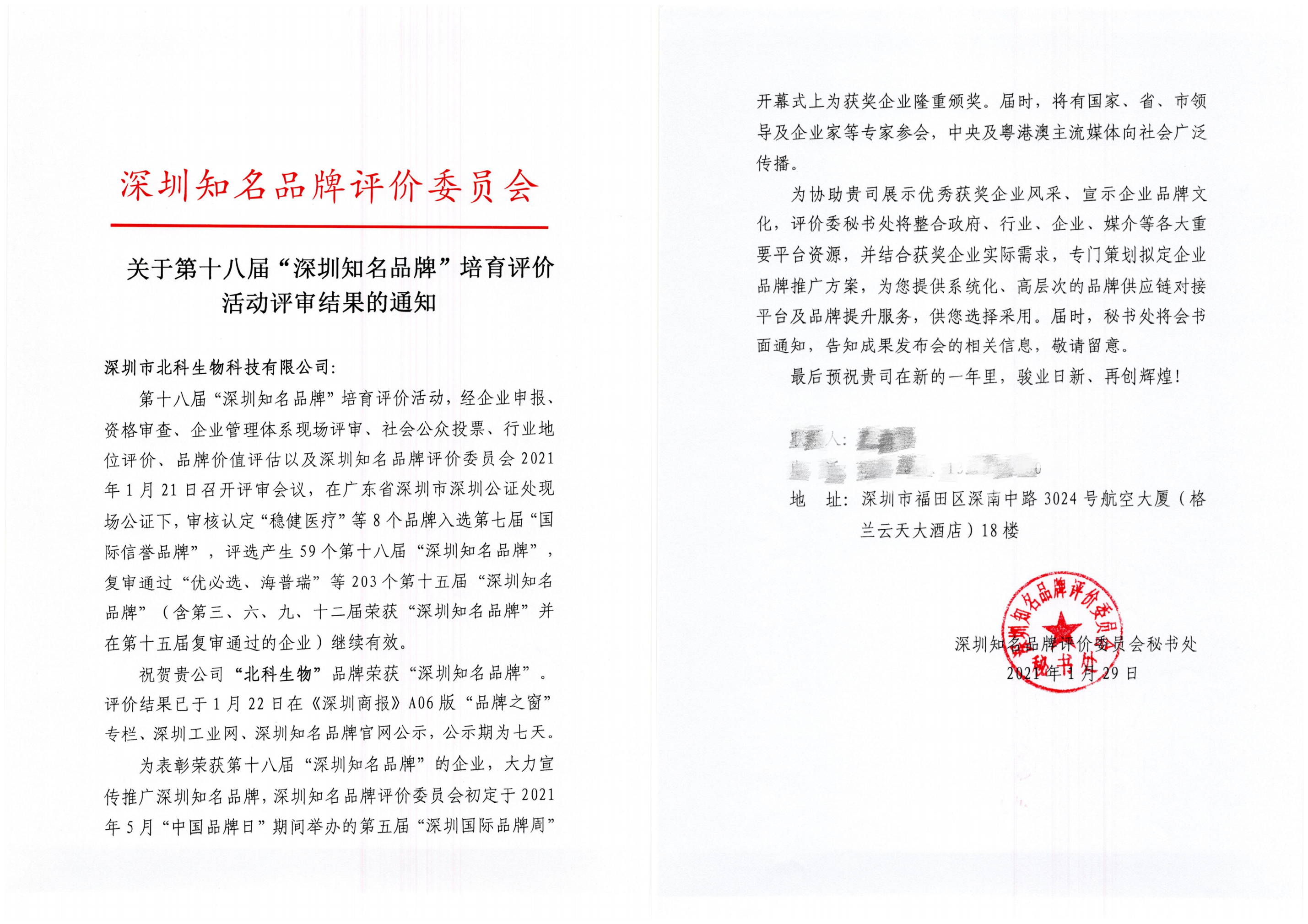 2021年1月21日,在深圳市工業總會舉辦的“深圳知名品牌”評審會議上,深圳市北科生物科技有限公司以市場占有率高、誠信度高、品牌知名度高從眾多品牌中脫穎而出榮獲“深圳知名品牌”殊榮,并于1月28日順利完成公示