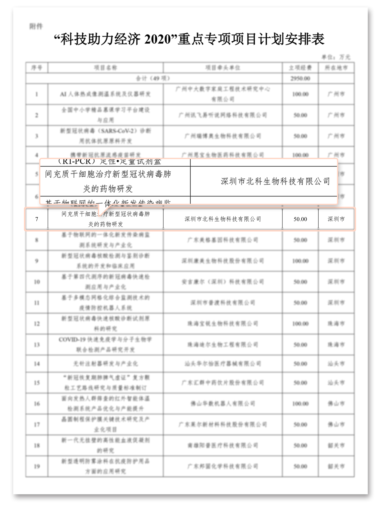 日前,由科技部支持的一批覆蓋國民經濟主要行業的技術創新項目陸續“揭榜”,廣東省科技廳正式發布了《廣東省科技廳關于下達2020年“科技助力經濟2020”重點專項項目計劃的通知》,其中深圳市北科生物科技有限公司(以下簡稱“北科生物”)牽頭的《間充質干細胞治療新型冠狀病毒肺炎的藥物研發》成功入選,獲“廣東省科技助力經濟2020”重點專項推薦項目。