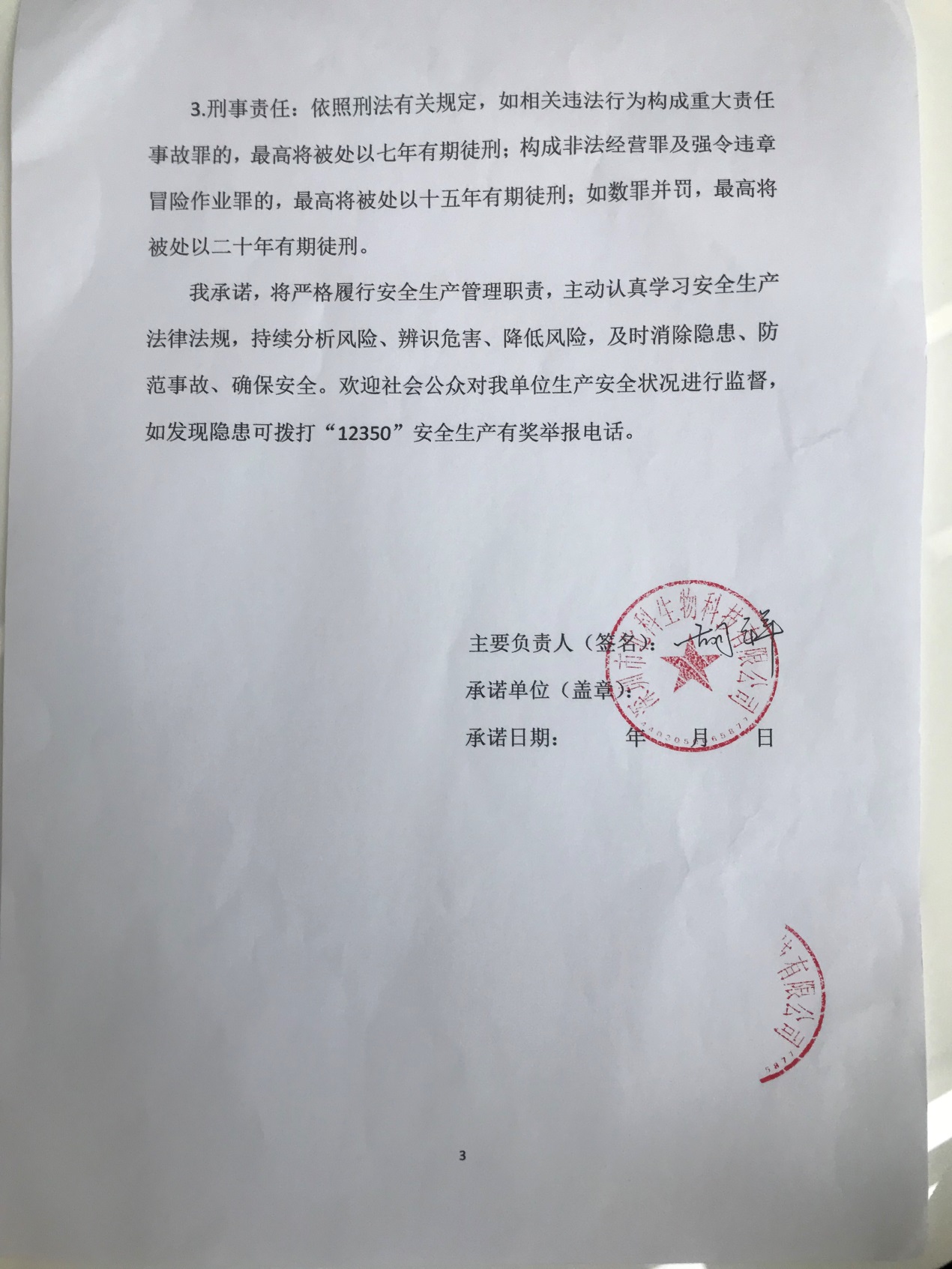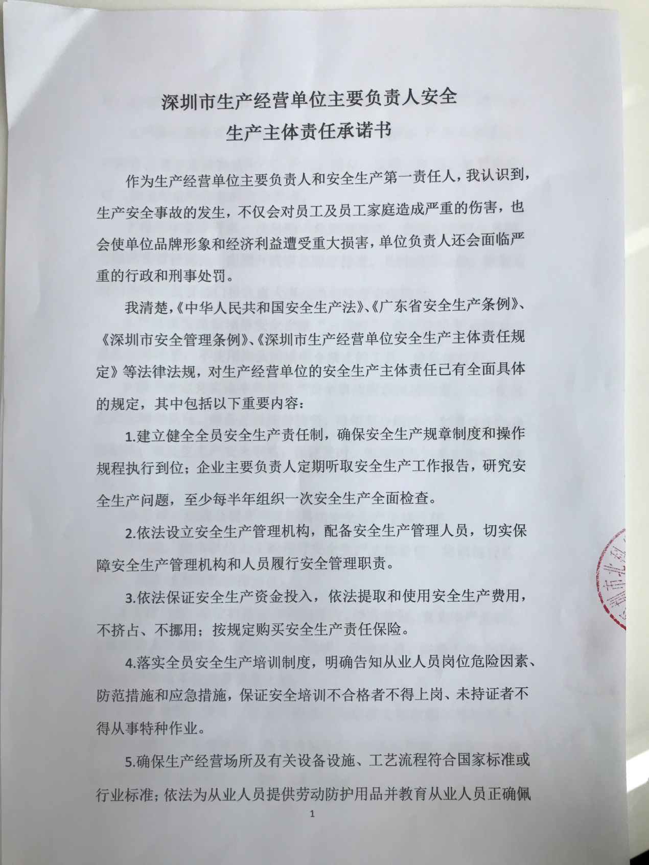 深圳市生產經營單位主要負責人安全生產主體責任承諾書