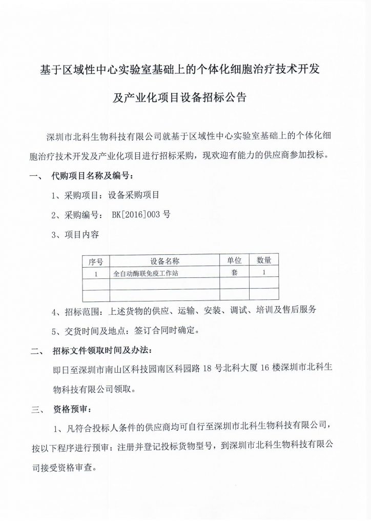 基于區域性中心實驗室基礎上的個體化細胞治療技術開發及產業化項目設備招標公告