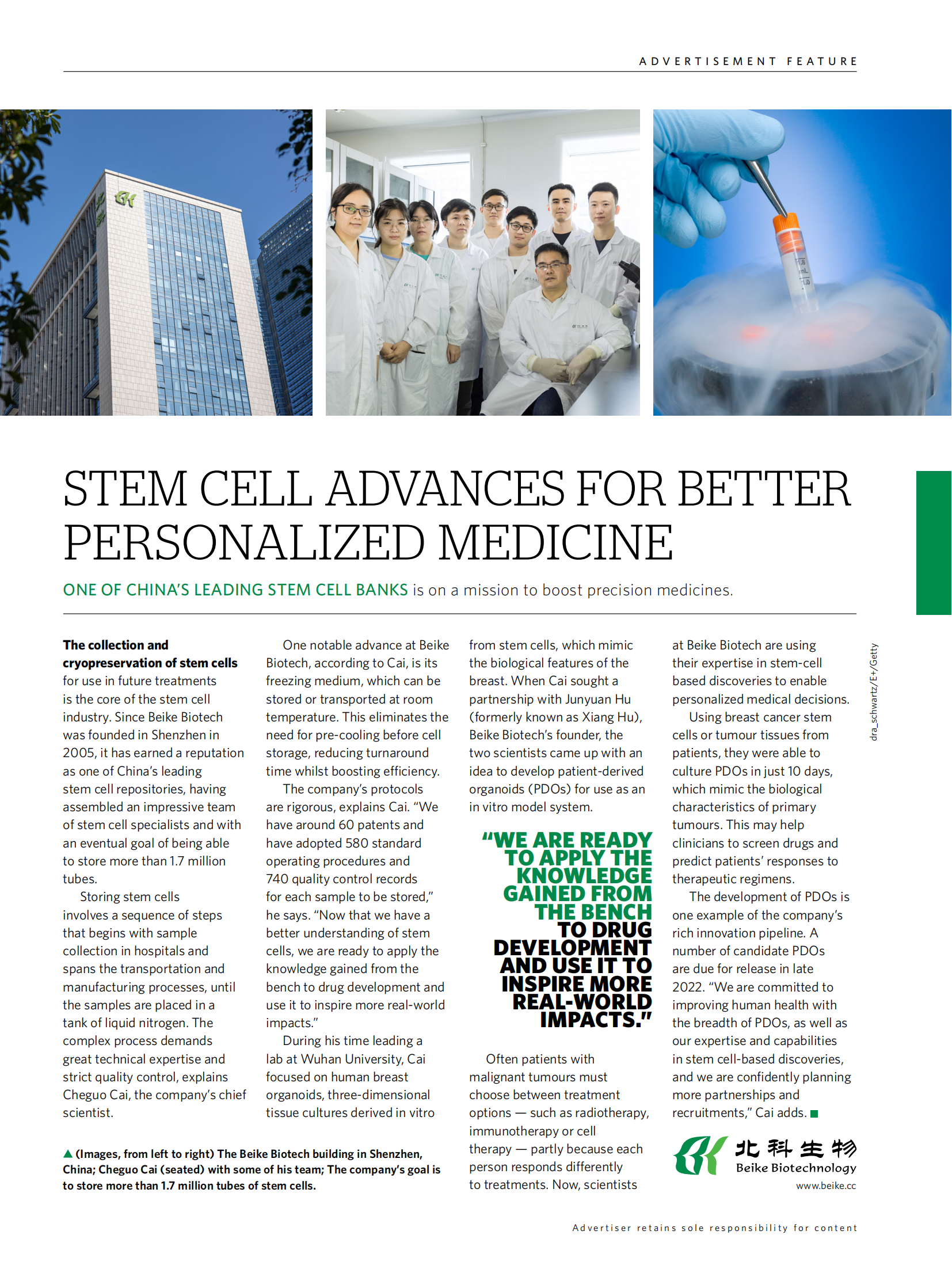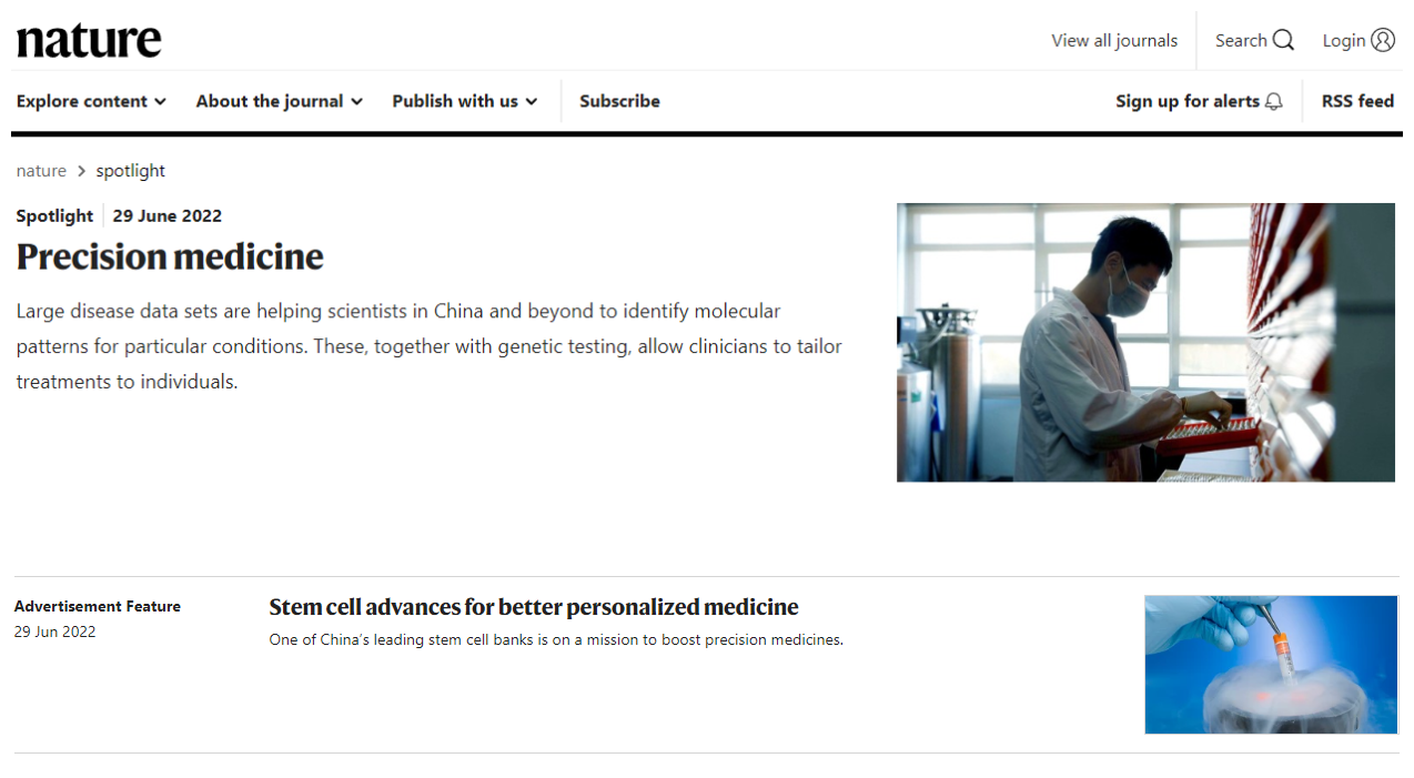2022年6月29日,《Nature》官網(wǎng)nature spotlight增刊的“自然聚焦-中國精準(zhǔn)醫(yī)療”板塊在線發(fā)表了北科生物首席科學(xué)家蔡車國教授團(tuán)隊(duì)的主題文章干細(xì)胞進(jìn)展推動(dòng)更好的個(gè)性化醫(yī)療