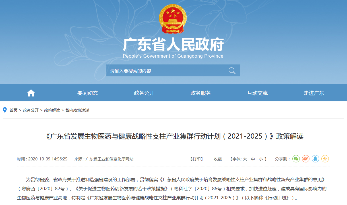 近日,廣東省科學技術廳、發展和改革委員會、工業和信息化廳、衛生健康委員會、市場監督管理局等五部門聯合發布《廣東省發展生物醫藥與健康戰略性支柱產業集群行動計劃(2021-2025年)》。
