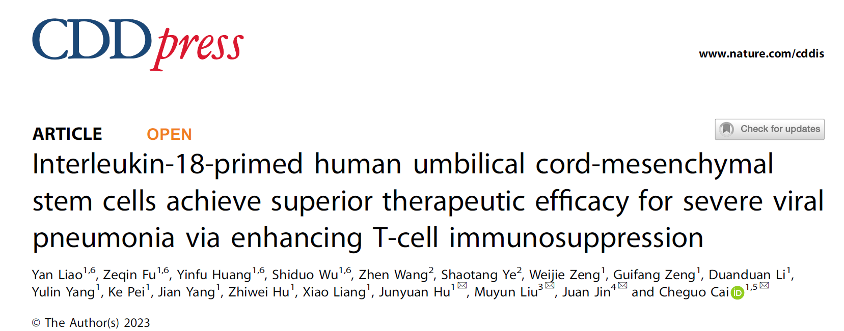 2023年1月28日,深圳市北科生物科技有限公司研發(fā)中心蔡車國教授和廖延博士團隊在國際權(quán)威學(xué)術(shù)期刊《Cell Death & Disease》(影響因子=9.68,中科院一區(qū))在線發(fā)表關(guān)于炎癥因子IL-18賦能型臍帶間充質(zhì)干細(xì)胞可增強針對重癥病毒性肺炎導(dǎo)致肺損傷治療效果的研究成果。論文題為:“Interleukin-18-primed human umbilical cord-mesenchymal stem cells achieve superior therapeutic efficacy for severe viral pneumonia via enhancing T-cell immunosuppression”。近年來。北科生物科研成果轉(zhuǎn)化穩(wěn)步提升,不僅體現(xiàn)在“量的增長”上,更體現(xiàn)在“質(zhì)的飛躍”上。北科生物在高水平論文,尤其是國際權(quán)威期刊的學(xué)術(shù)論文發(fā)表方面不斷取得突破, 正是其科研實力和技術(shù)創(chuàng)新方面的實力體現(xiàn)。