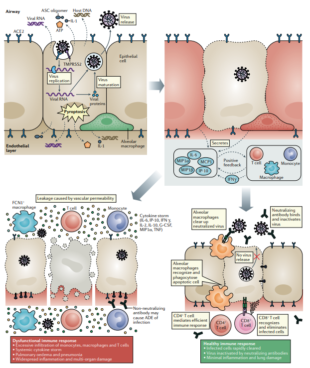 2019年底爆發(fā)的新型冠狀病毒,是一種人群普遍易感的病毒類型,以肺部病變?yōu)橹鳎腥咎卣鳛榘l(fā)熱、干咳、氣促、肺部有炎癥性改變等。由于對新冠病毒感染缺乏有效的治療藥物,臨床主要依靠對癥支持治療為主,部分患者在肺炎進入進展期后,容易發(fā)生急性呼吸窘迫綜合征而危及生命。而由于自身免疫細(xì)胞識別并攻擊病毒,重癥患者體內(nèi)可能會誘發(fā)強烈的免疫反應(yīng),肺部出現(xiàn)多種且大量的炎癥細(xì)胞因子,體內(nèi)免疫平衡破壞,最終導(dǎo)致肺部器官嚴(yán)重?fù)p傷,出現(xiàn)嚴(yán)重的呼吸障礙(圖1)。